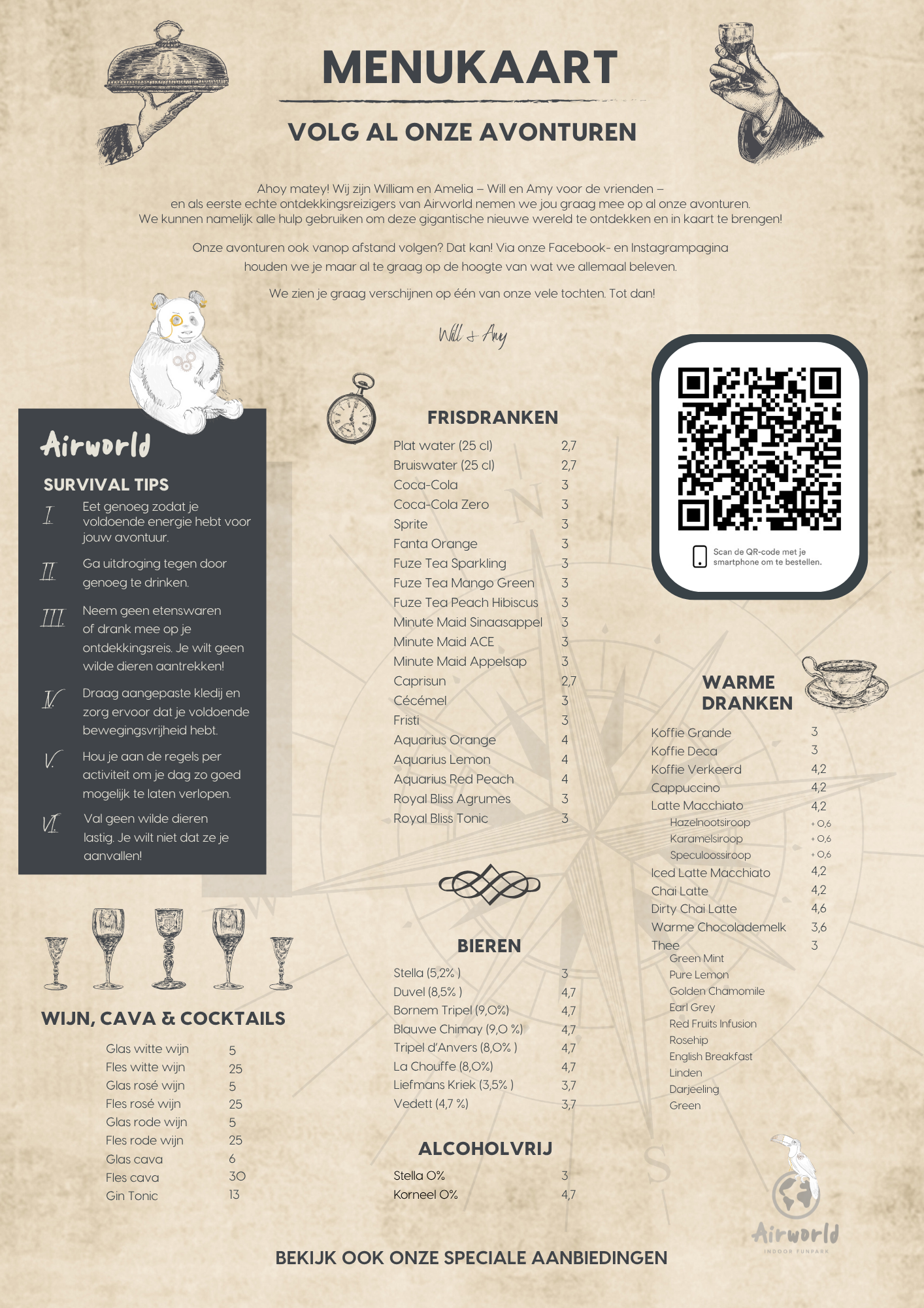 Wij vragen onze klanten vriendelijk om geen eigen eten en drinken mee te nemen. Baby voeding is hierop natuurlijk een uitzondering. Heb je vragen over allergenen of intolleranties stel ze dan gerust vooraf via hello@airworld.be